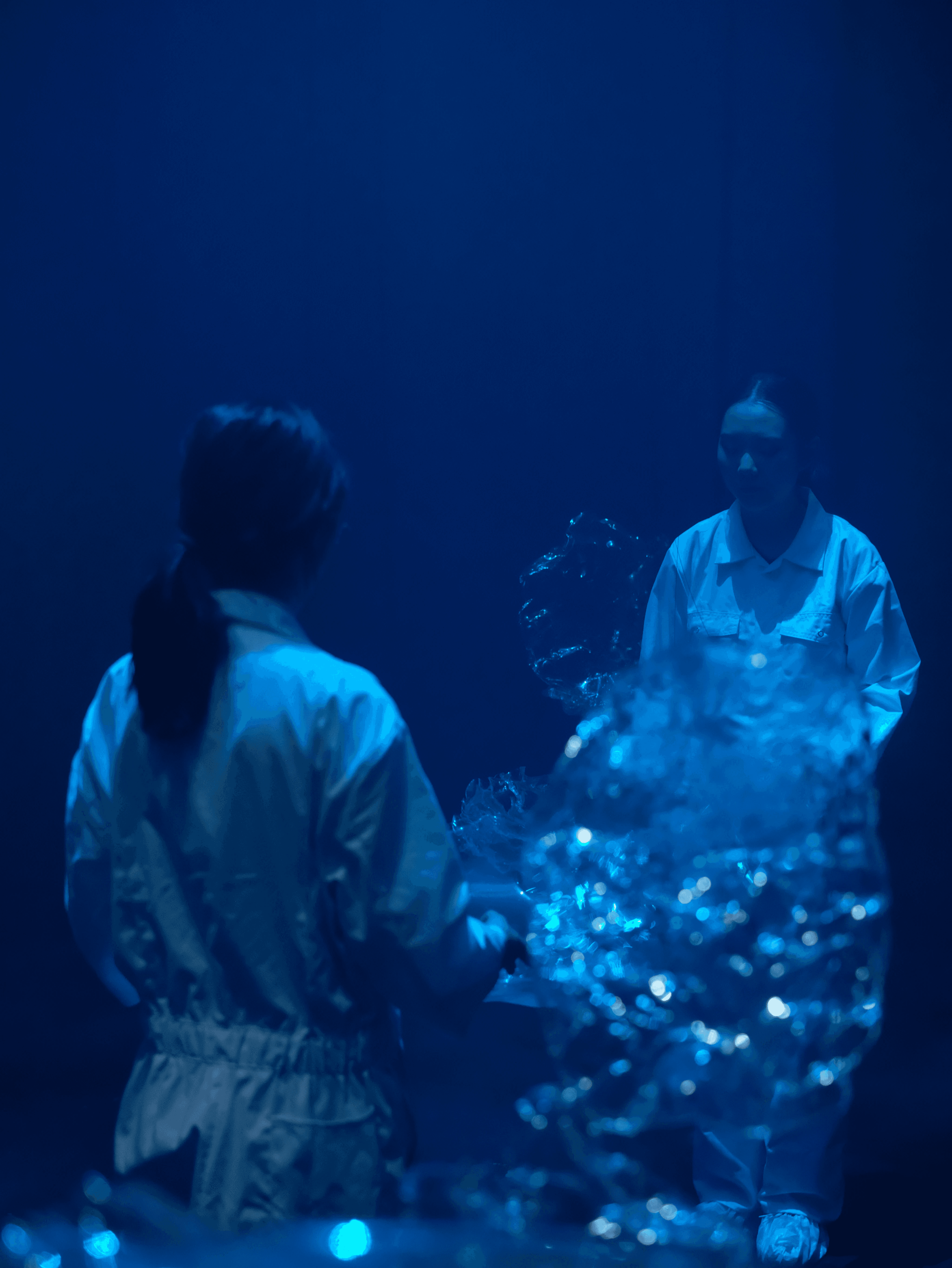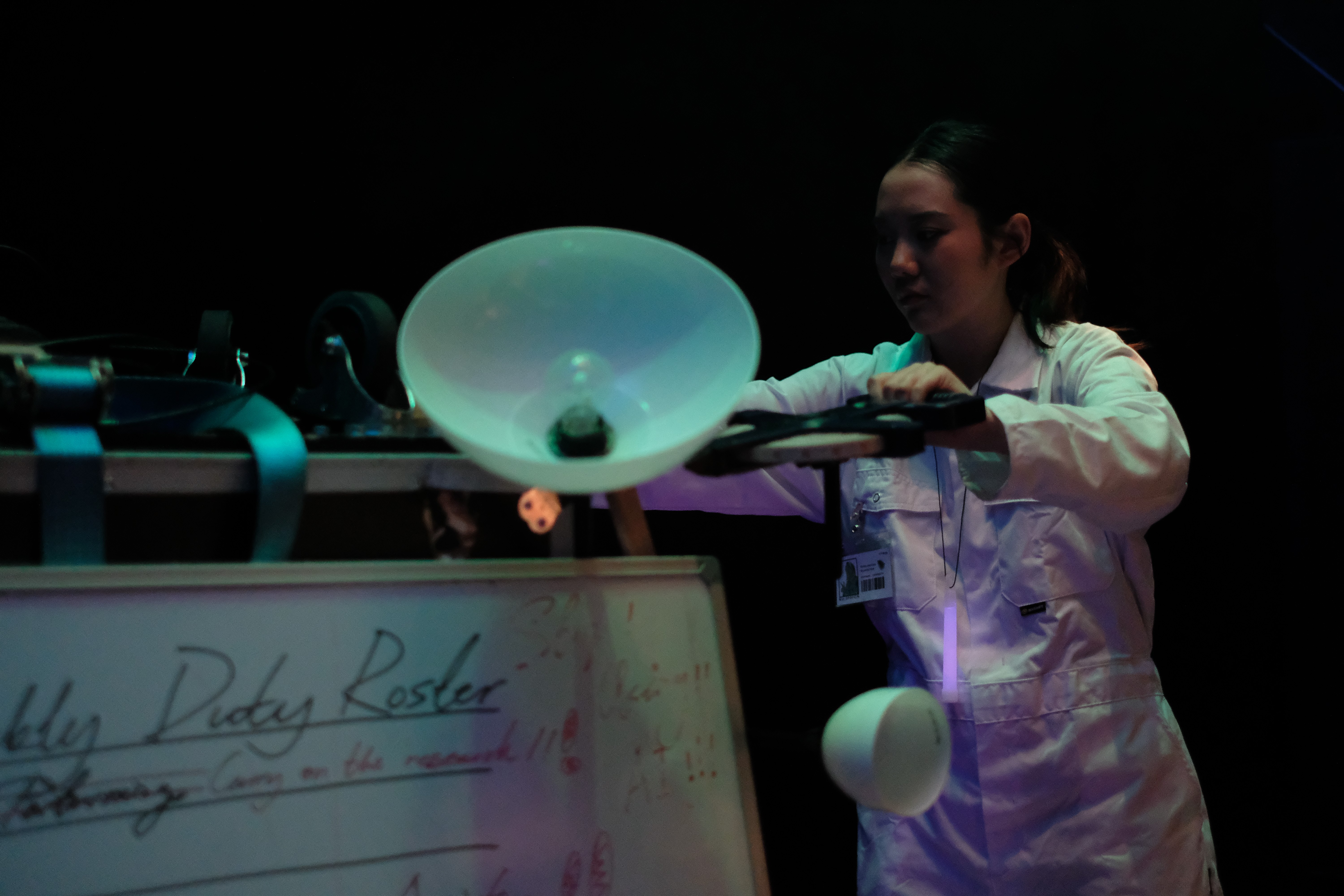 This show assumes an archaeological visit to Milton Court Theatre, 50 years later, and AI is awakened to revive the long-abandoned propaganda show of the foreign planet colonisation project. The mystery of the artistic experience lures people to invest through curiosity, and the authority of the scientific presentation convinces them to invest, but these are narratives, not facts, and the AI is left behind after the failure, alone and confused, just as we are today.