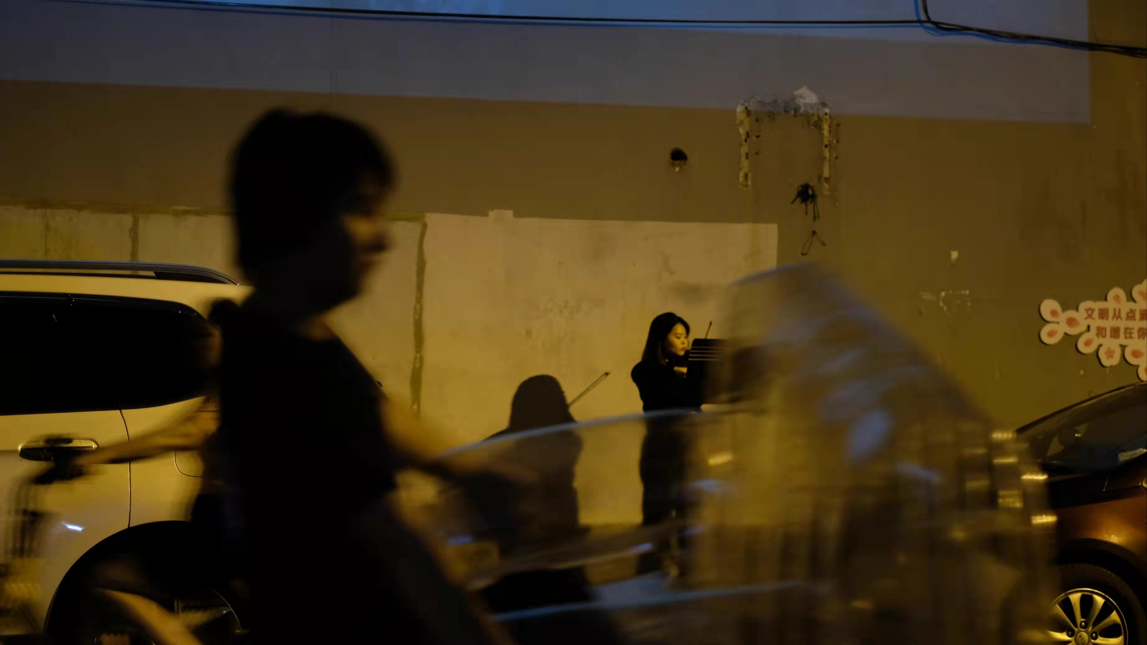 In response to these changes, Silhouette invited audiences on a walking journey through streets within a three-kilometre radius of Tilanqiao. Along the route, they encountered live physical movement, spoken excerpts from Invisible Cities by Italo Calvino, and a solo violin performance responding to the atmosphere of the surrounding environment. These fragments of text, sound, and movement created a poetic dialogue with the district itself.